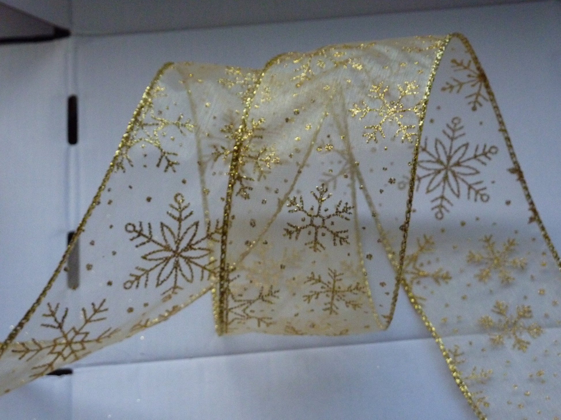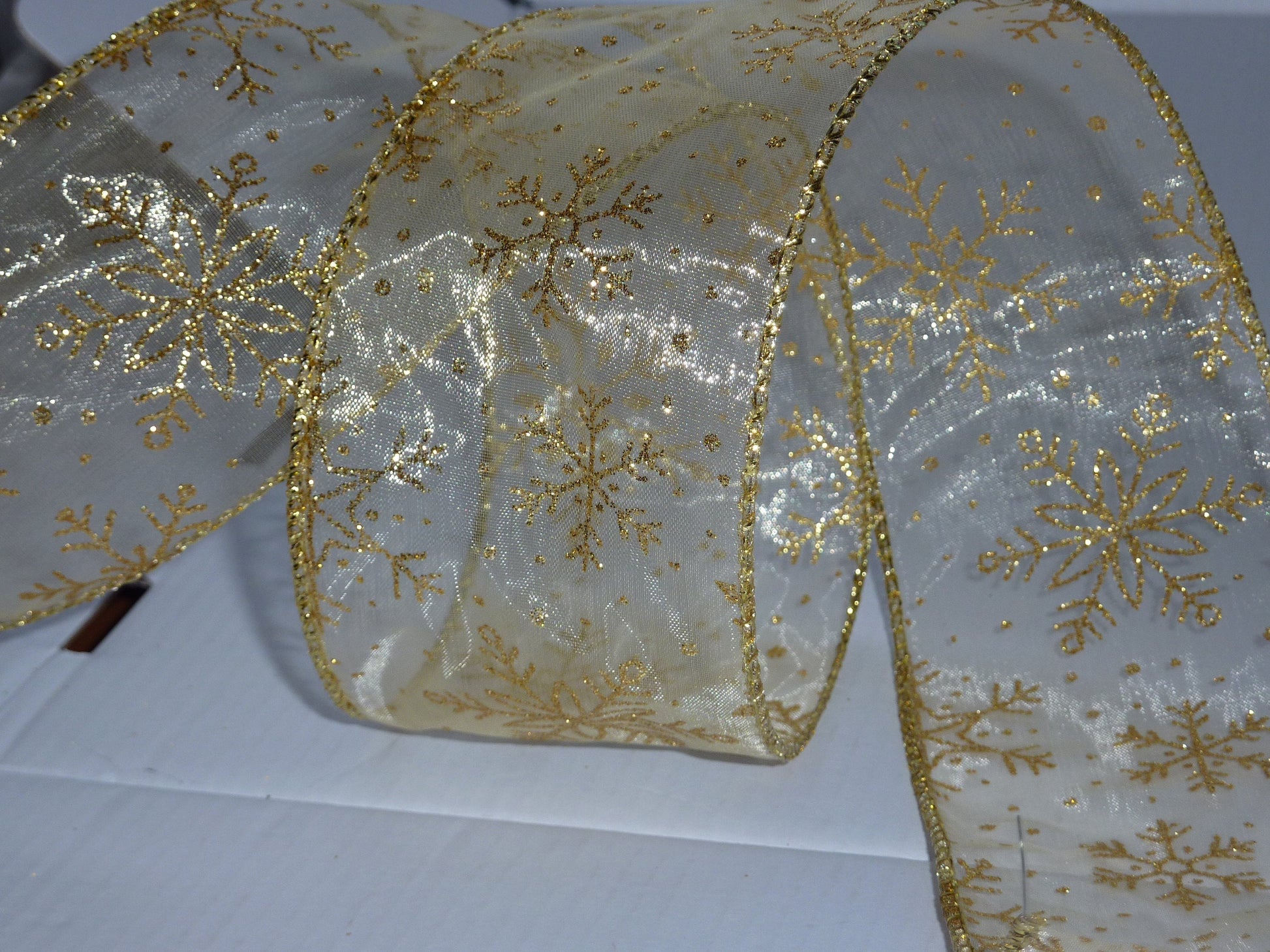 Wire Edged Festive Sheer Gold Glitter Snowflake Ribbon 63mm Wide x 1 Metre
